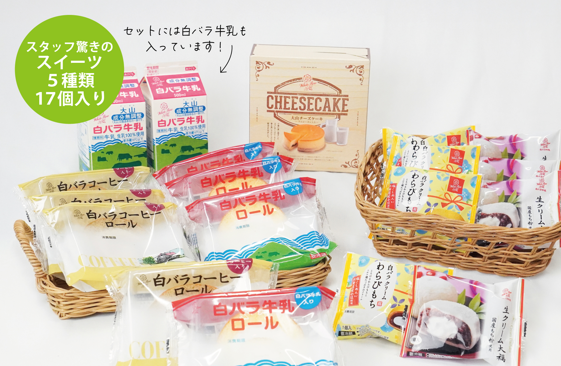白バラ牛乳ロールケーキ、白バラコーヒーロールケーキ、白バラクリームわらびもち、生クリーム大福、大山チーズケーキの5種類が全部で17個も入ったスイーツ三昧福袋です。一緒にお届けする白バラ牛乳と一緒に楽しめる、白バラスイーツを満喫できる価格もスペシャルなセットです。