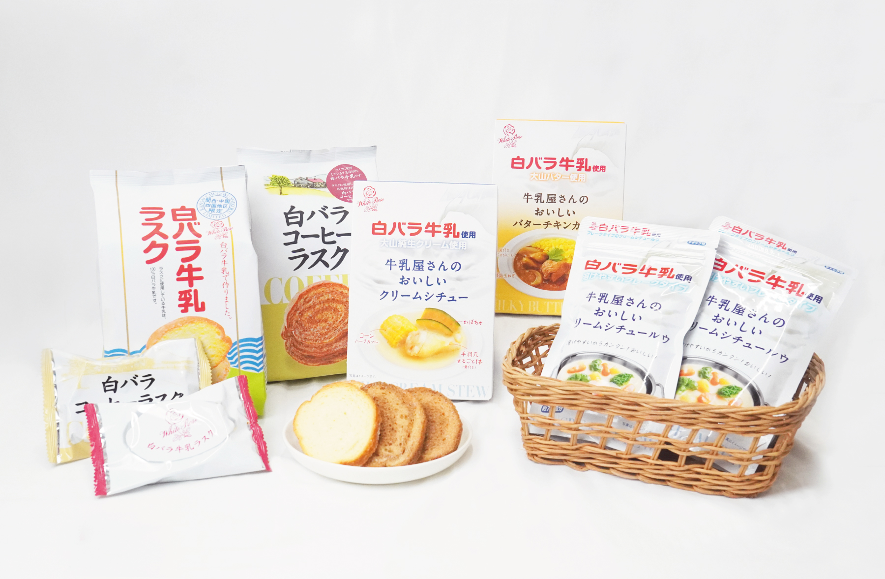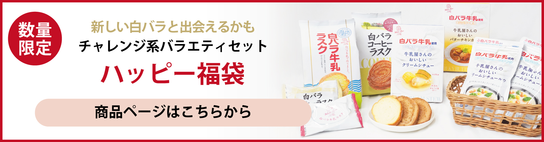 オンラインストア初登場の「白バラ牛乳ラスク」「牛乳屋さんのクリームシチュー」を含む6品の詰め合わせセットです。いつもの「白バラ」のセットとは内容を変えて、牛乳を使った様々な商品でハッピーになってほしい!そんな気持ちを込めたチャレンジ系バラエティセットをぜひお楽しみください。
