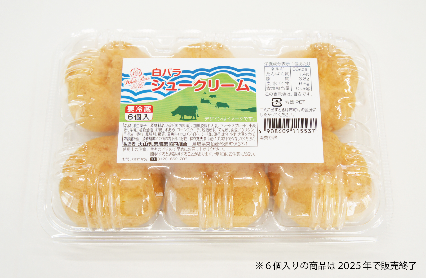 白バラシュークリームは、れん乳、牛乳を使用したミルククリームを使用。ミルク風味豊かで、とろっとしたなめらかクリームが特徴です。地元鳥取県では「パックのシュークリーム」として長年親しまれ、大山乳業農協のシュークリームの代名詞とも言える商品でしたが、昨年おしまれつつ55年の販売期間を終了しました。